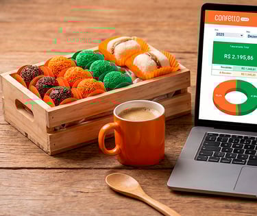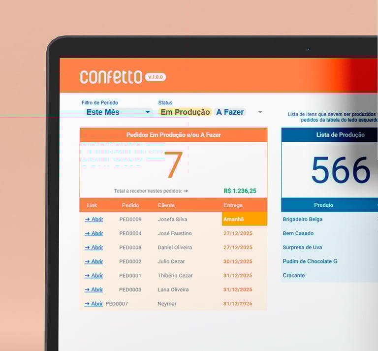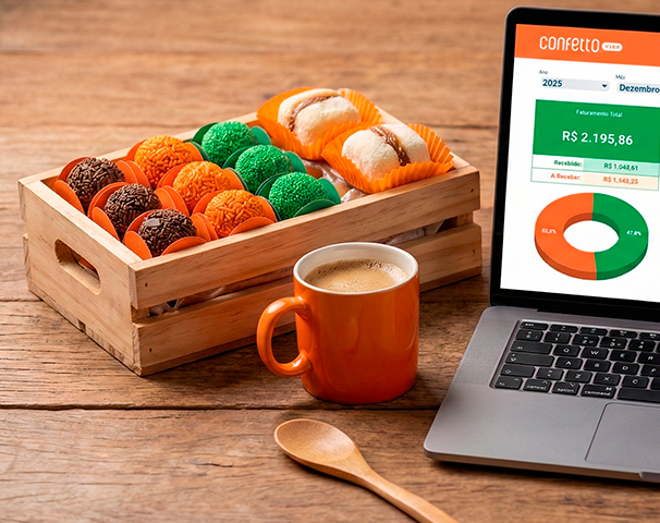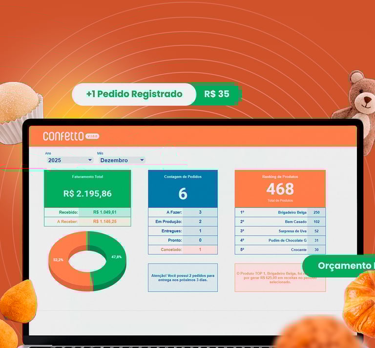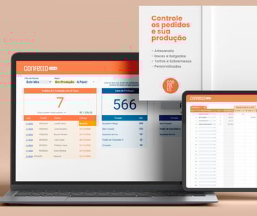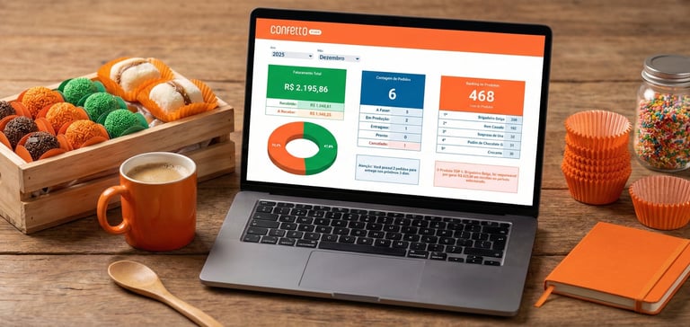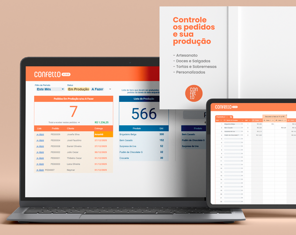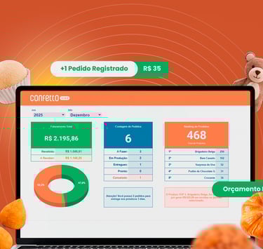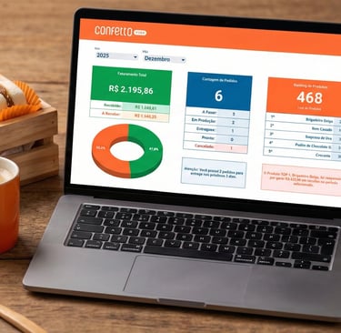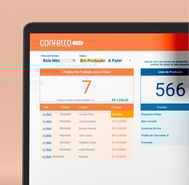 Abandone o caderninho e os softwares caros. Gerencie encomendas, orçamento e produção com a Confetto: o sistema inteligente na nuvem que roda direto no seu Google Planilhas.
