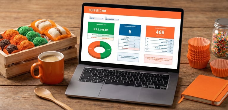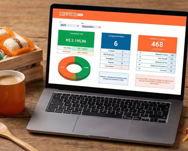 Abandone o caderninho e os softwares caros. Gerencie encomendas, orçamento e produção com a Confetto: o sistema inteligente na nuvem que roda direto no seu Google Planilhas.