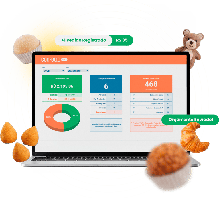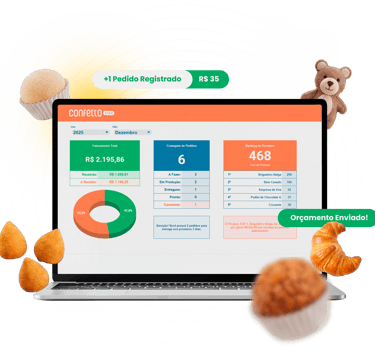 Abandone o caderninho e os softwares caros. Gerencie encomendas, orçamento e produção com a Confetto: o sistema inteligente na nuvem que roda direto no seu Google Planilhas.
